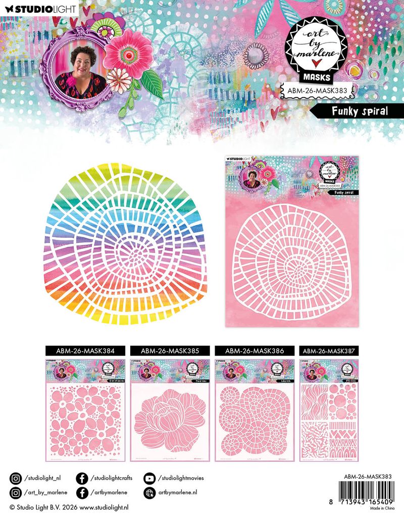 Add a burst of artistic flair to your crafting projects with this eye-catching Funky Spirals mask by Art by Marlene. Measuring 203x203x1mm, this single-piece mask features vibrant, swirling designs that bring dynamic movement and personality to mixed media work, scrapbooking, and DIY creations. Perfect for layering, stencilling, or creating bold focal points, this versatile mask lets you achieve professional-looking results with minimal effort. Transform ordinary projects into extraordinary pieces with this playful, spirited design that's sure to inspire your next creative masterpiece.