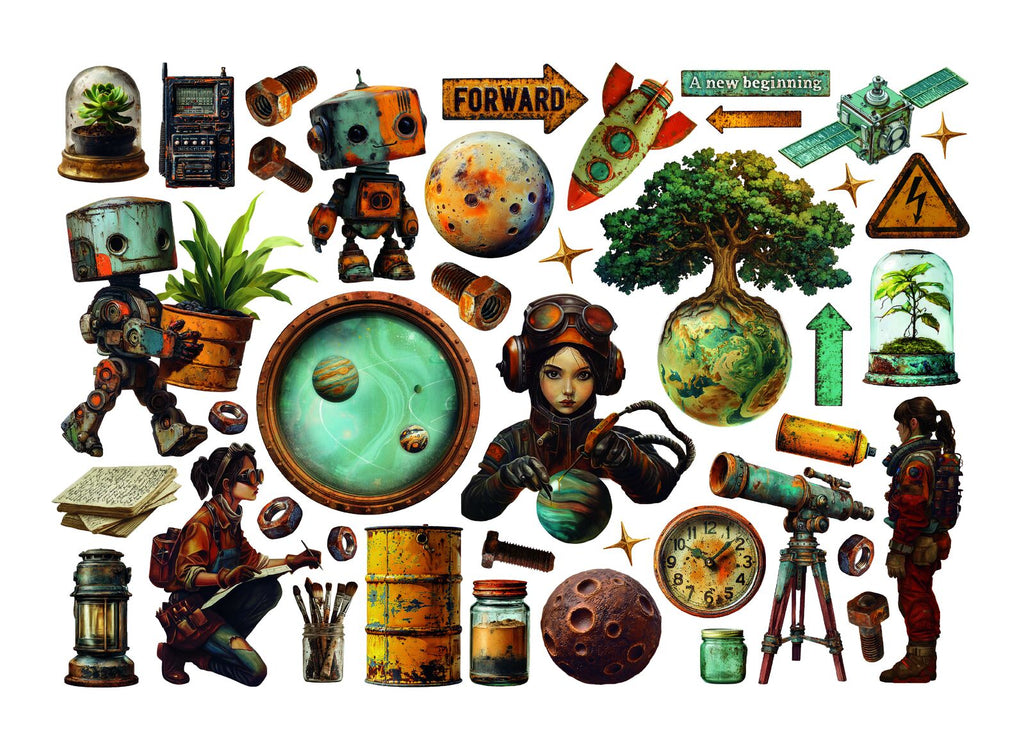 Stamperia's A New Beginning ephemera collection brings vintage steampunk futuristic design elements to your creative projects. This curated set features beautifully printed die-cut pieces including decorative accents that blend nostalgic aesthetics with imaginative, forward-thinking details. Perfect for layering, embellishing layouts, card-making, and adding dimensional character to mixed media work. Each piece is pre-cut and ready to use, saving time while bringing professional-quality finishes to your designs. Ideal for crafters seeking unique, high-quality ephemera that combines retro charm with contemporary artistic vision.