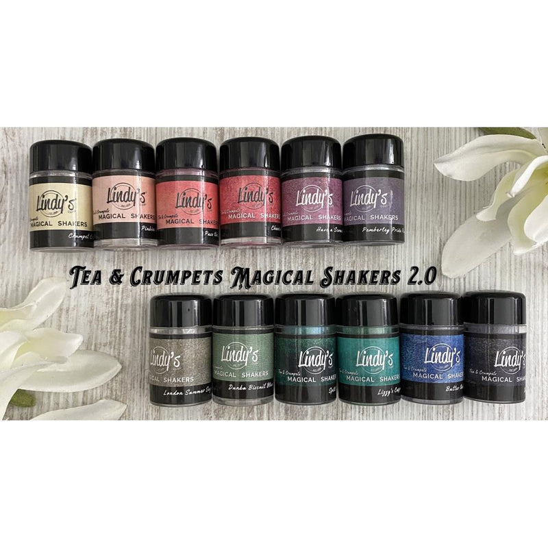 Lindy's Stamp Gang Magical Shaker 2.0 Set 12/Pkg Tea & Crumpets - Designed for use on everything from paper to wood, the dye-based powders are non-toxic and acid-free. Sprinkle them directly onto a porous surface and spray it with water for a vibrant stain, or customize your projects by adding them to any art medium (including resin, polymer clay, ect.) Add a little for a softer version of the colour and a lot for a deep, vibrant tinting. This package contains 12- 10g shaker jar of pearlized mica powder, powdered dye and a fixative. Colours included: Crumpet Crumbs, Pinkies Up Pink, Cherrio Cherry, Pass The Jam Jane, Lizzy's Cuppa Tea Teal, Dunak' Biscuit Blue Green, Spill The Tea Teal, London Summer Sage, Butter The Toast Blue, Darcy In Denim, Pemberly Pride Purple, and Have A Scone Heather. Made in USA.