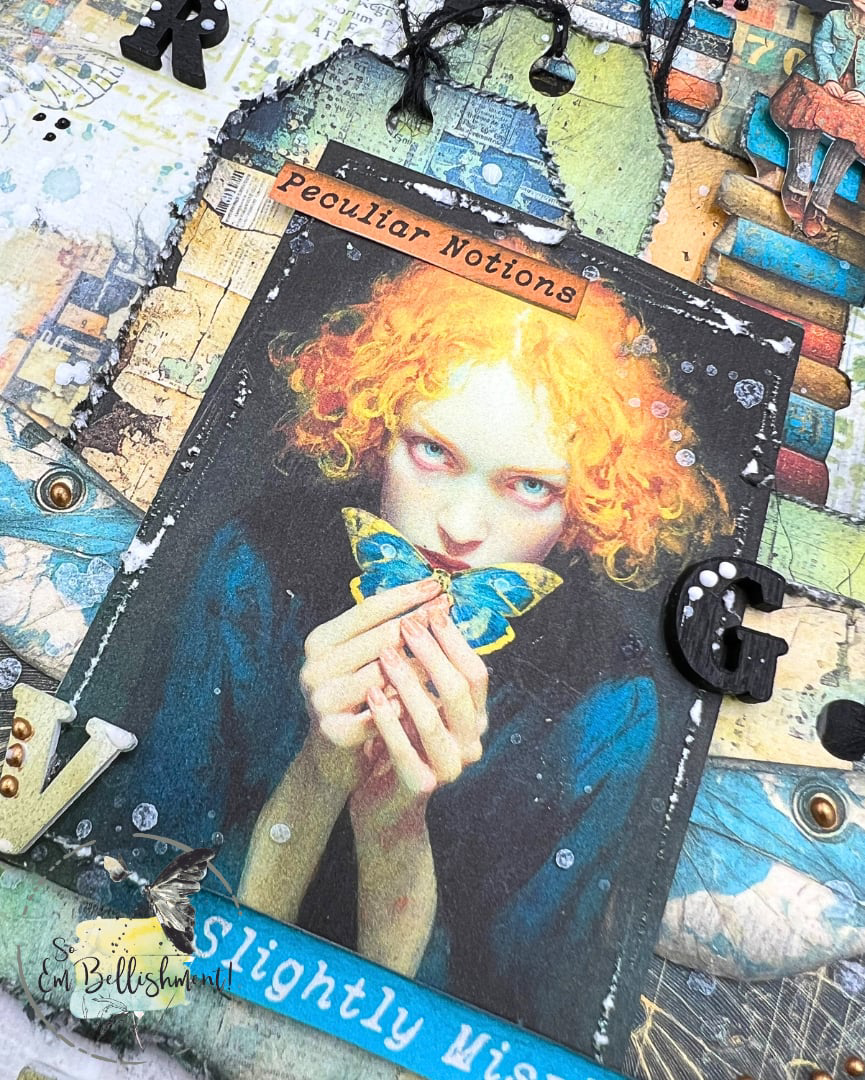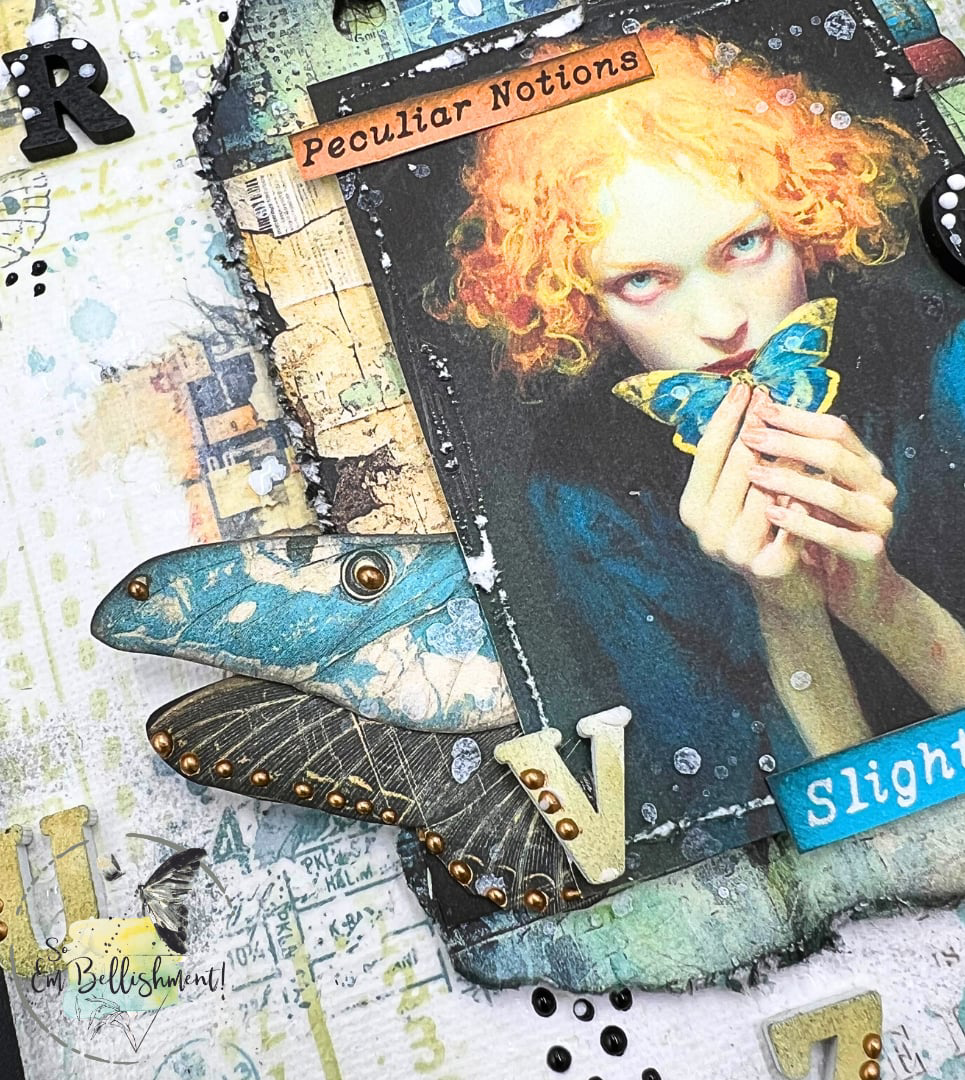A 5x7 canvas with a dark and grungy under tone, this project features mood and a little whimsy.